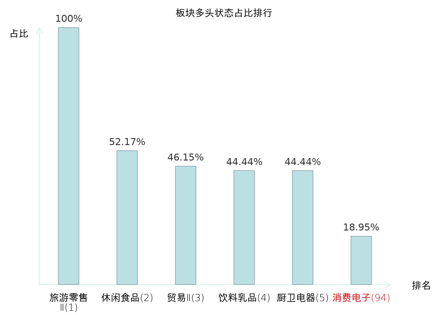 全市场所有行业板块中主力多头状态占比排名中,旅游零售Ⅱ板块位居第一。乘用车板块名次提升最快,较昨日上升91位。