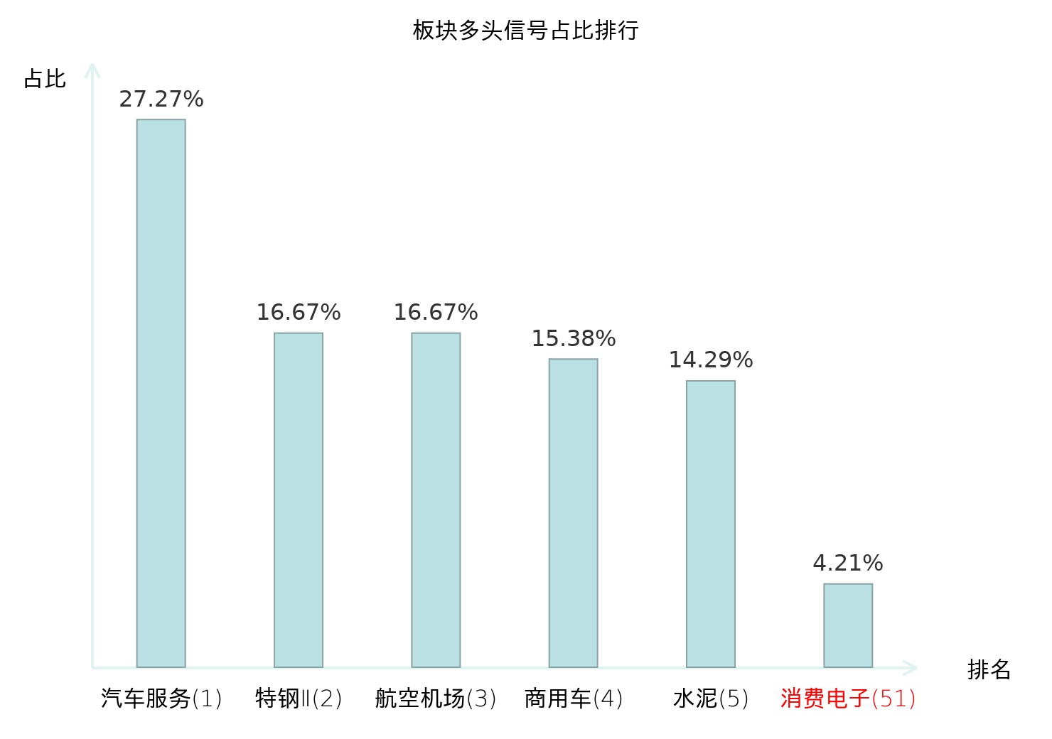 全市场所有行业板块中主力多头信号占比排名中,汽车服务板块位居第一。汽车服务板块名次提升最快,较昨日上升112位。