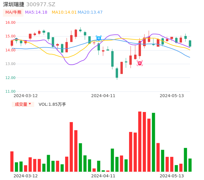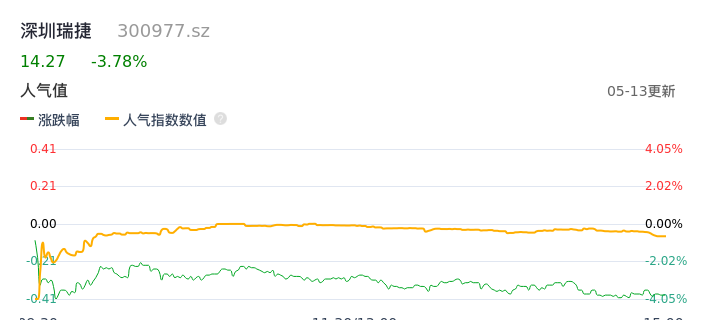 05月13日,深圳瑞捷收报14.27,股价涨幅-3.78%,成交金额2658.72万元,换手率4.77%。