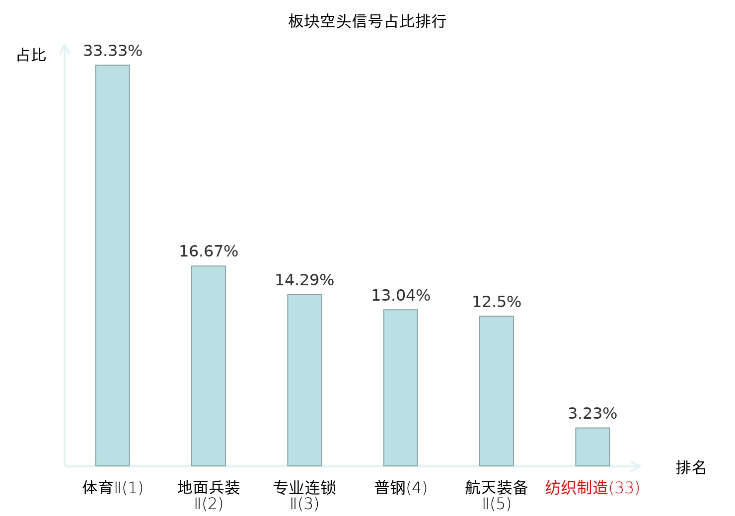 全市场所有行业板块中主力空头信号占比排名中,体育Ⅱ板块位居第一。地面兵装Ⅱ板块名次提升最快,较昨日上升108位。