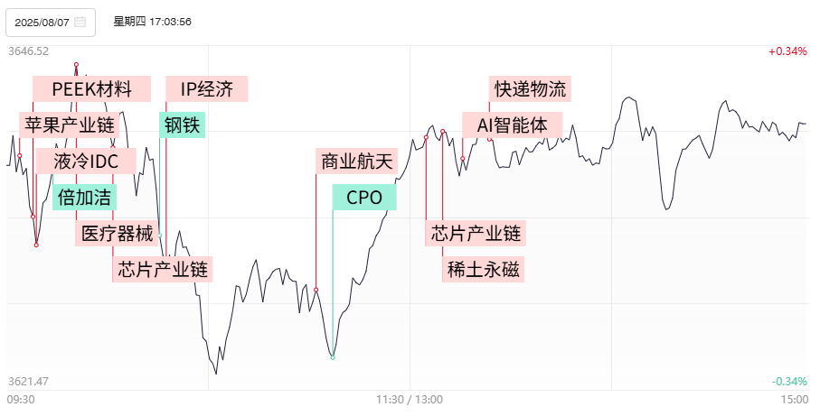 财联社8月7日讯,今日59股涨停,16股炸板,封板率为79%,中马传动7天6板,长城军工6天5板,北纬科技、国机精工、福日电子4连板,日海智能、洪通燃气、华光环能、中欣氟材3连板,利德曼20cm6天4板,东芯股份20cm8天4板。市场全天震荡分化,沪指再创年内新高,创业板指调整。沪深两市全天成交额1.83万亿,较上个交易日放量914亿。盘面上,市场热点较为杂乱,个股跌多涨少,全市场超3000只个股下跌。板块方面,稀土永磁、半导体、物流、医疗器械等板块涨幅居前,创新药、保险、铜箔、光伏等板块跌幅居前。截至收盘,沪指涨0.16%,深成指跌0.18%,创业板指跌0.68%。