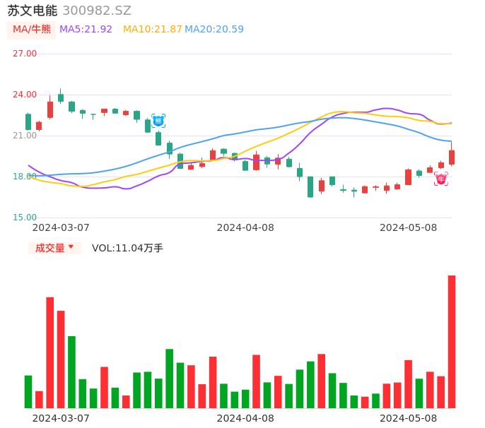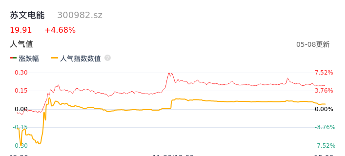 05月08日,苏文电能收报19.91,股价涨幅4.68%,成交金额2.19亿元,换手率5.69%。