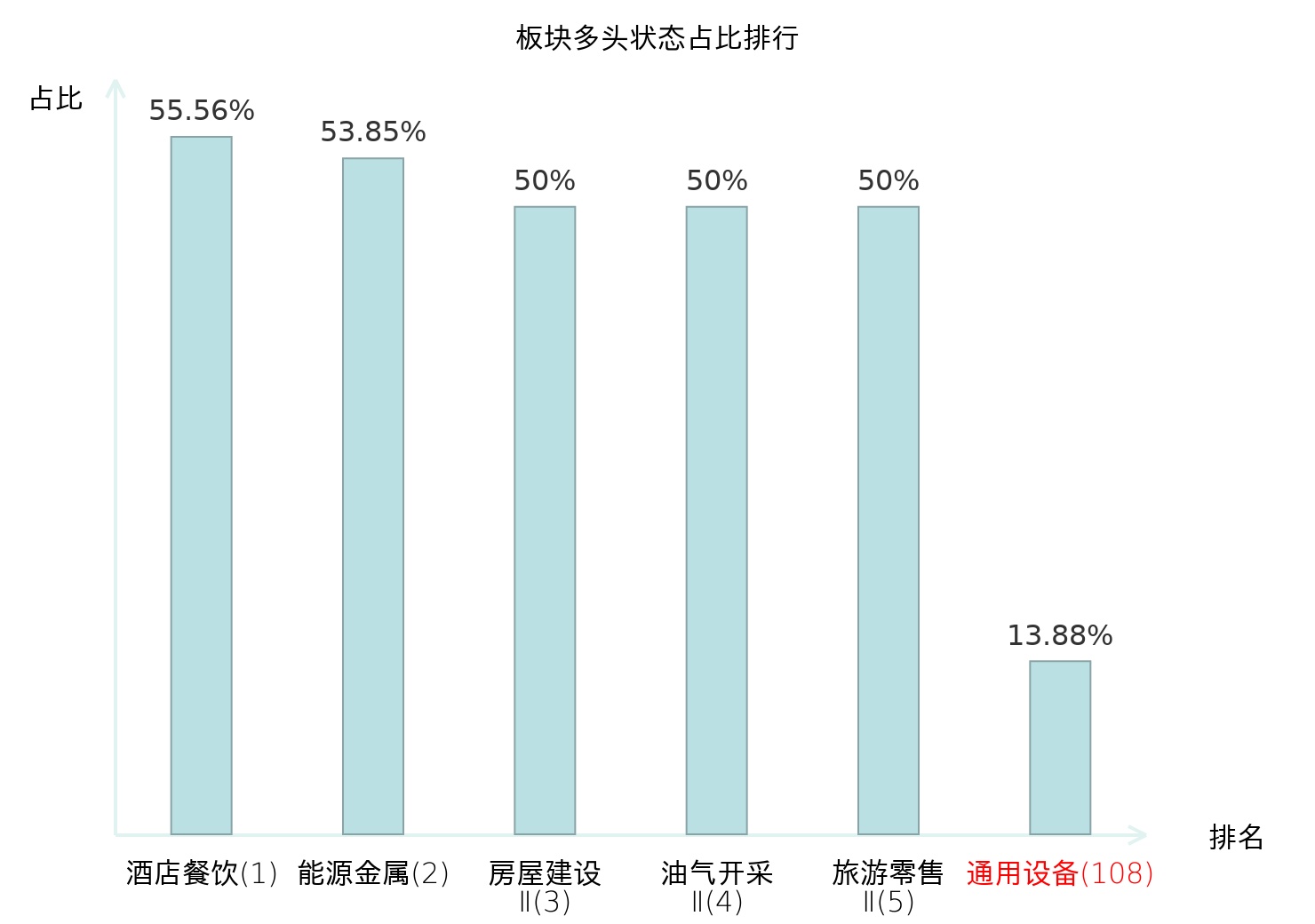 全市场所有行业板块中主力多头状态占比排名中,酒店餐饮板块位居第一。饰品板块名次提升最快,较昨日上升84位。