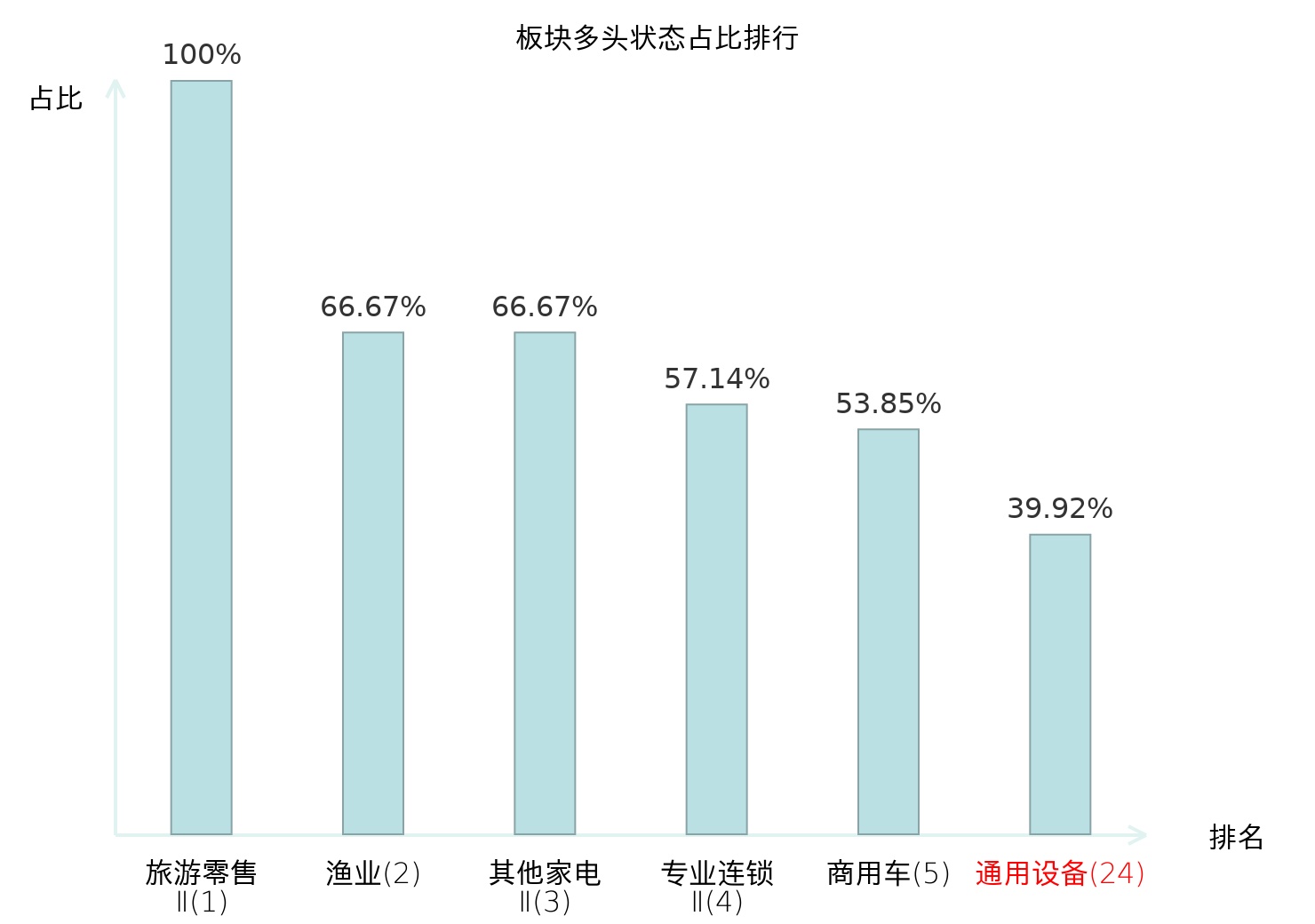 全市场所有行业板块中主力多头状态占比排名中,旅游零售Ⅱ板块位居第一。农产品加工板块名次提升最快,较昨日上升46位。