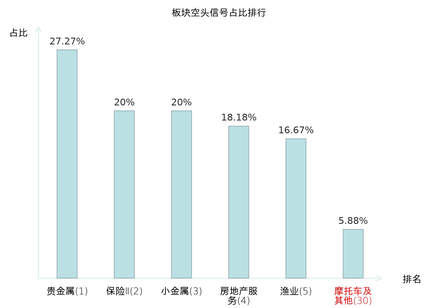 全市场所有行业板块中主力空头信号占比排名中,贵金属板块位居第一。小金属板块名次提升最快,较昨日上升117位。