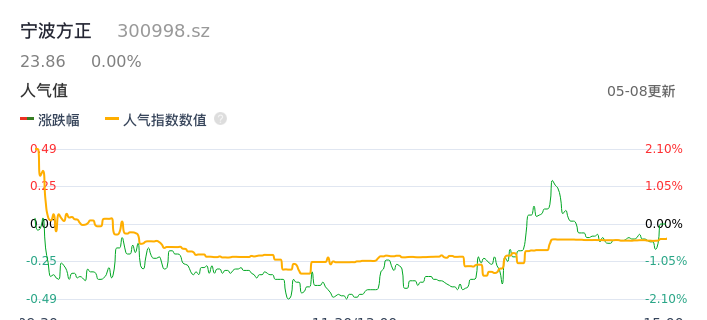 05月08日,宁波方正收报23.86,股价涨幅0.00%,成交金额8368.38万元,换手率5.39%。