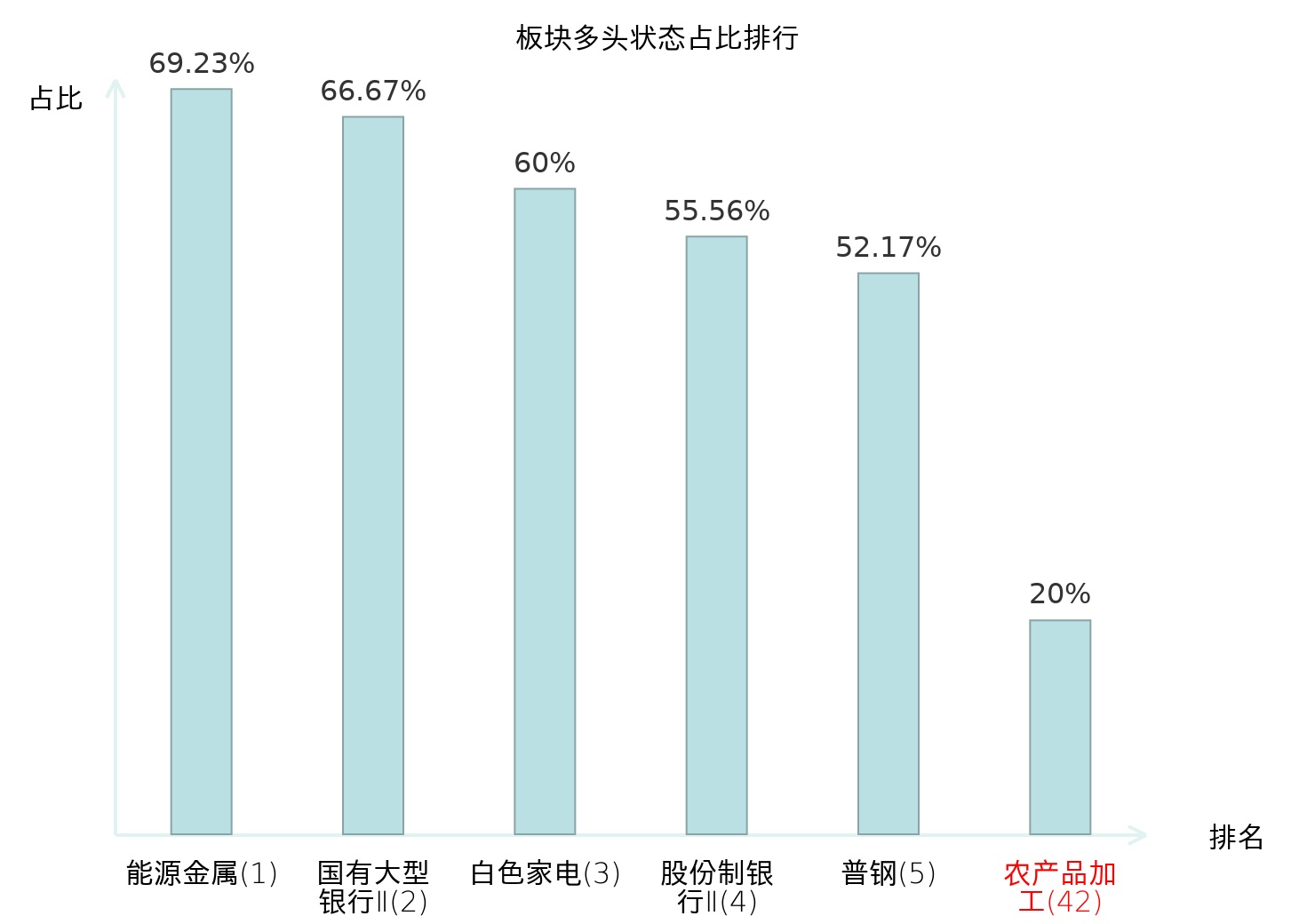 全市场所有行业板块中主力多头状态占比排名中,能源金属板块位居第一。贸易Ⅱ板块名次提升最快,较昨日上升69位。