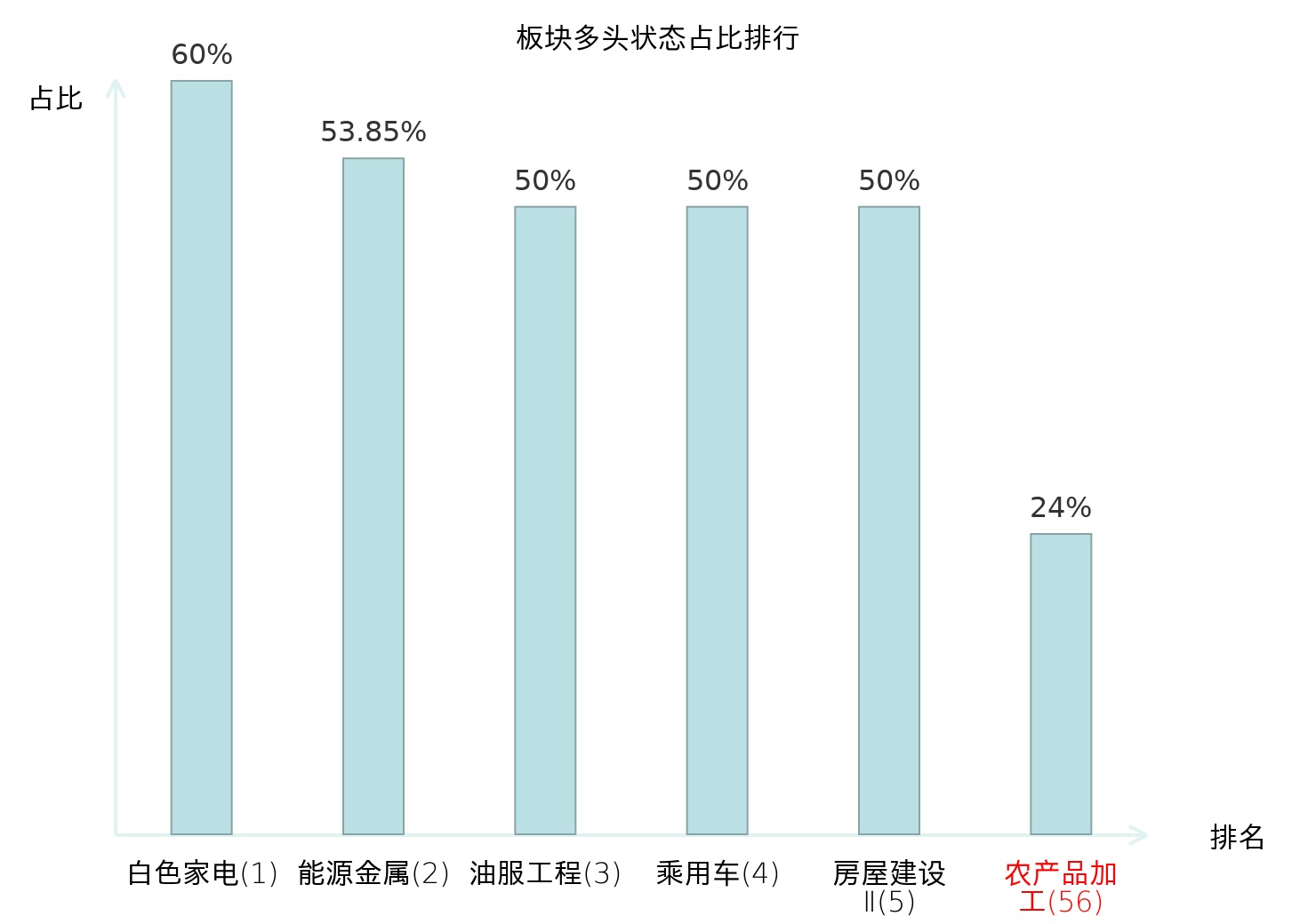 全市场所有行业板块中主力多头状态占比排名中,白色家电板块位居第一。油气开采Ⅱ板块名次提升最快,较昨日上升45位。