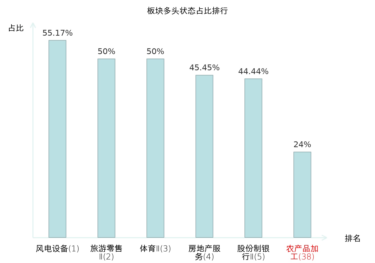 全市场所有行业板块中主力多头状态占比排名中,风电设备板块位居第一。保险Ⅱ板块名次提升最快,较昨日上升64位。