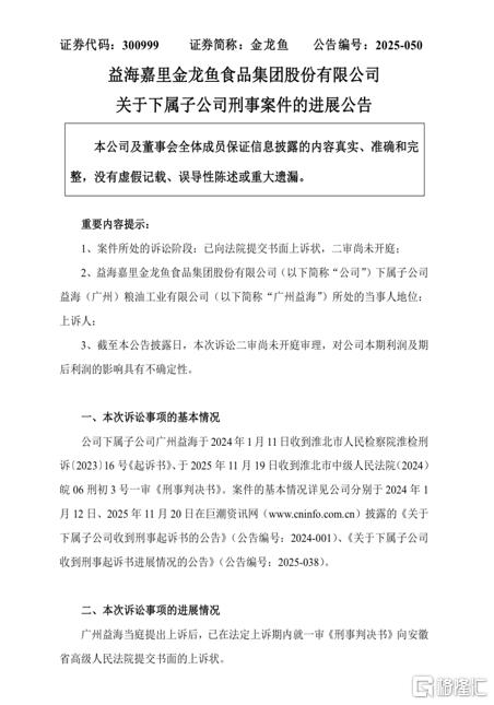 11月20日,金龙鱼发布公告,称下属子公司广州益海收到一审判决,被判构成合同诈骗罪。