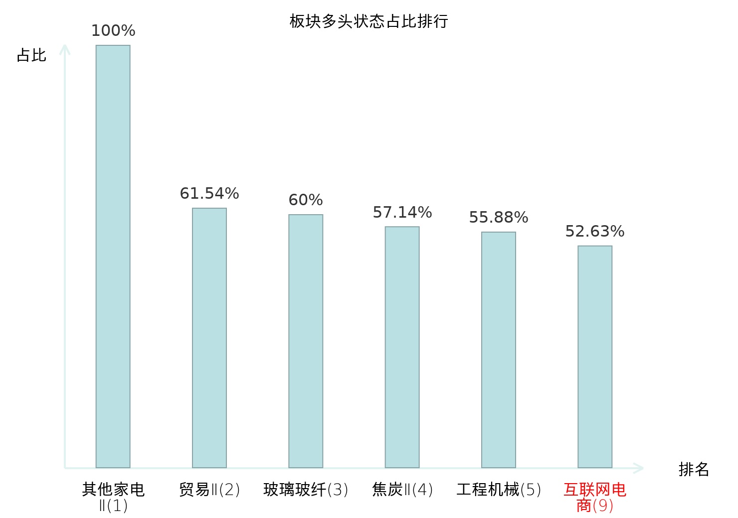 全市场所有行业板块中主力多头状态占比排名中,其他家电Ⅱ板块位居第一。航海装备Ⅱ板块名次提升最快,较昨日上升98位。
