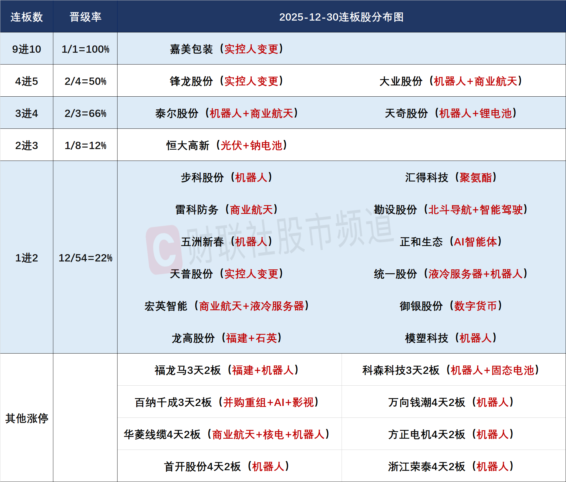 今日共54股涨停,连板股总数18只,其中三连板及以上个股6只,上一交易日共18只连板股,连板股晋级率33.33%(不含ST股、退市股)。