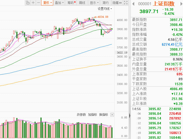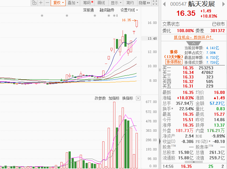 市场情绪:深成指、创业板指一度双双跌超1%。沪深两市成交额1.59万亿,较上一个交易日缩量2805亿,全市场超3700只个股下跌。今日全市场共47股涨停,连板股总数16只,19股封板未遂,封板率为71%(不含ST股、退市股)。焦点股方面,福建本地股航天发展13天9板、榕基软件12天7板,并购重组的金富科技7连板,股权转让的梦天家居10天7板,光刻胶概念股国风新材10天6板。