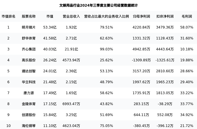 华立科技最新报告期数据为三季度,下表汇总了文娱用品行业内市值靠前的公司三季度主要经营数据