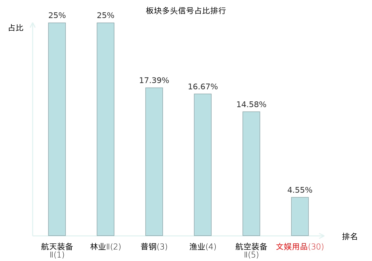 全市场所有行业板块中主力多头信号占比排名中,航天装备Ⅱ板块位居第一。林业Ⅱ板块名次提升最快,较昨日上升124位。