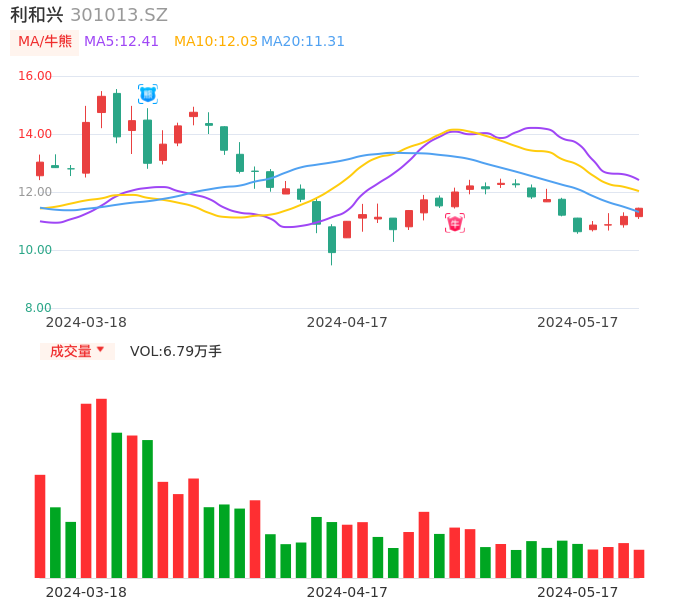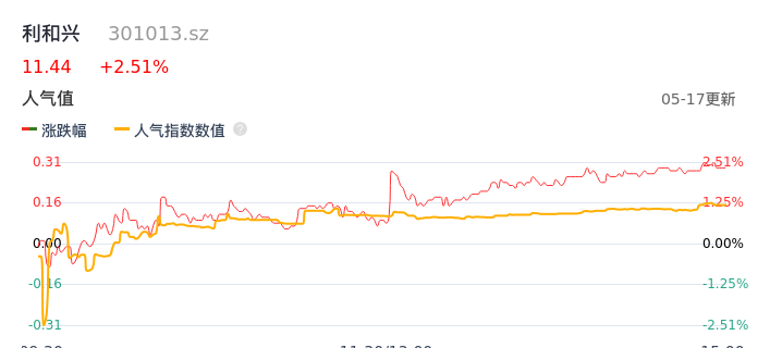 05月17日,利和兴收报11.44,股价涨幅2.51%,成交金额7669.49万元,换手率4.08%。
