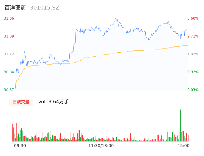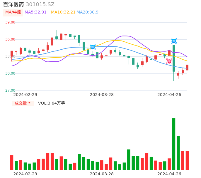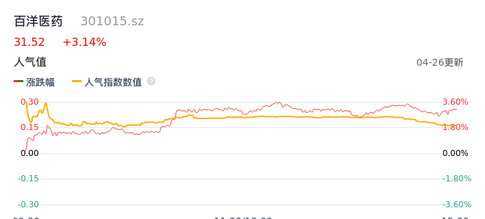 04月26日,百洋医药收报31.52,股价涨幅3.14%,成交金额1.14亿元,换手率3.06%。
