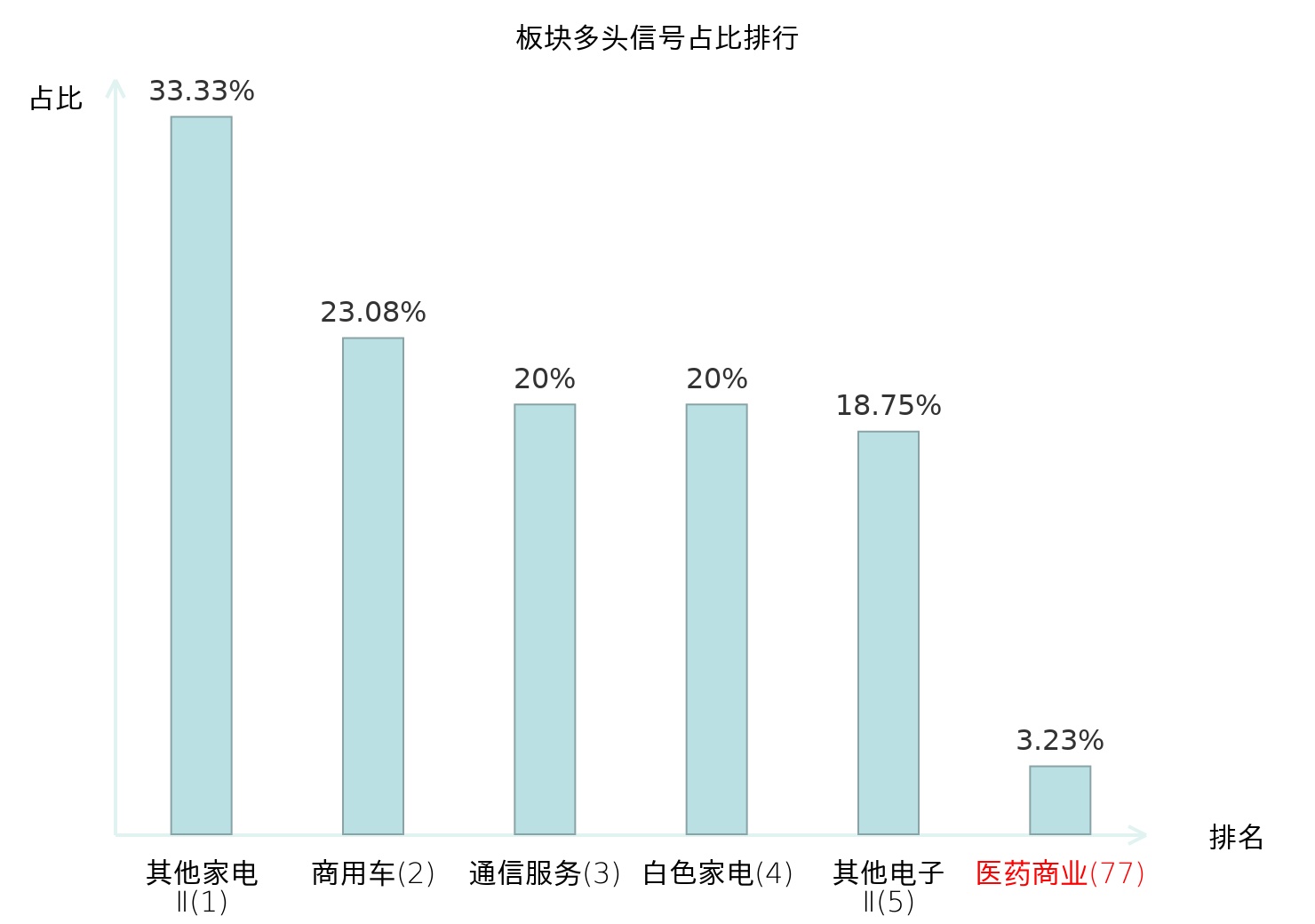 全市场所有行业板块中主力多头信号占比排名中,其他家电Ⅱ板块位居第一。其他家电Ⅱ板块名次提升最快,较昨日上升129位。
