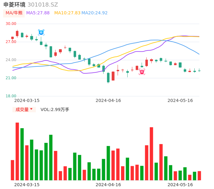 05月16日,申菱环境收报22.18,股价涨幅0.68%,成交金额6666.68万元,换手率2.64%。