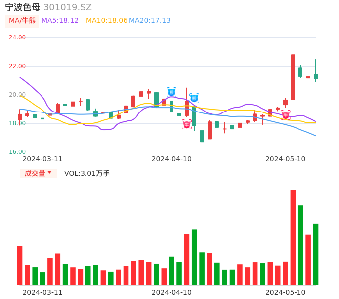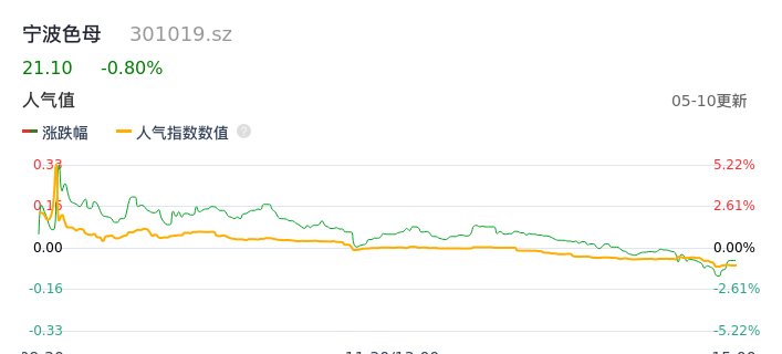 05月10日,宁波色母收报21.10,股价涨幅-0.80%,成交金额6517.79万元,换手率5.15%。