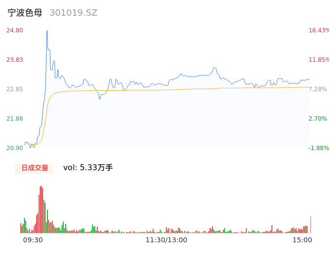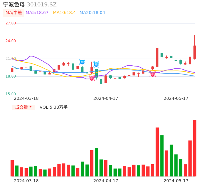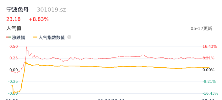 05月17日,宁波色母收报23.18,股价涨幅8.83%,成交金额1.22亿元,换手率9.14%。