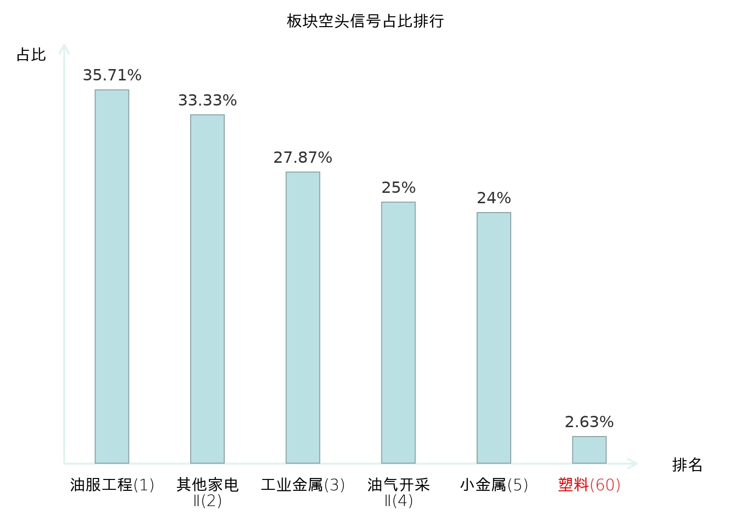 全市场所有行业板块中主力空头信号占比排名中,油服工程板块位居第一。工业金属板块名次提升最快,较昨日上升122位。
