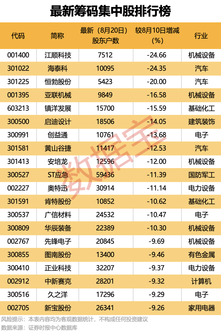 股东户数降幅最多的是江顺科技,截至8月20日最新股东户数为7512户,较8月10日环比下降24.66%;其次是海泰科,截至8月20日最新股东户数为10095户,环比下降24.35%;恒勃股份最新股东户数5423户,环比下降20%。