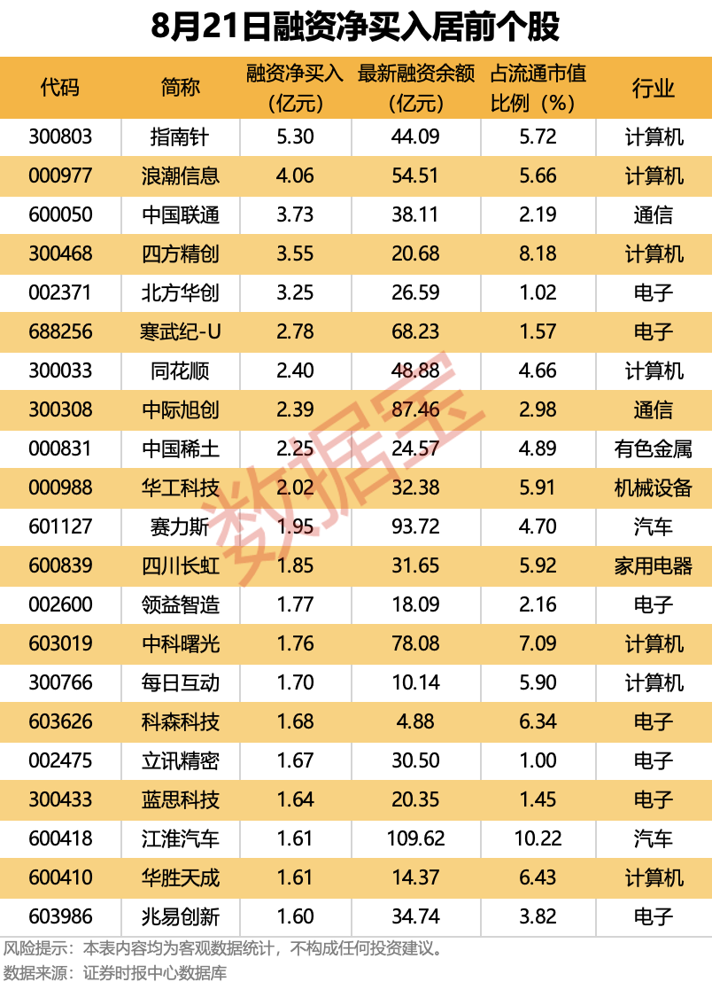 具体到个股,8月21日获融资净买入1亿元以上的共有44股,指南针融资净买入额居首,当日净买入5.3亿元;其次是浪潮信息、中国联通,融资净买入金额分别为4.06亿元、3.73亿元。