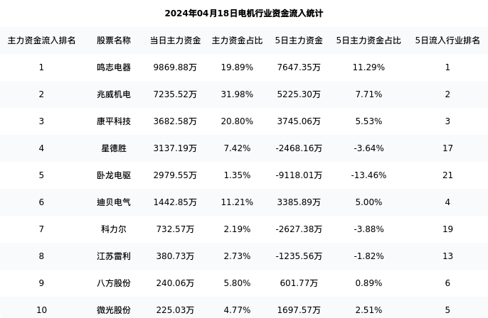 从主力资金流向来看,电机行业今日主力资金流入18.03亿元,在所有申万二级行业中排名:42/131。