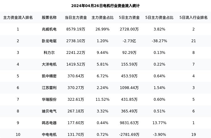 从主力资金流向来看,电机行业今日主力资金流入16.08亿元,在所有申万二级行业中排名:107/131。