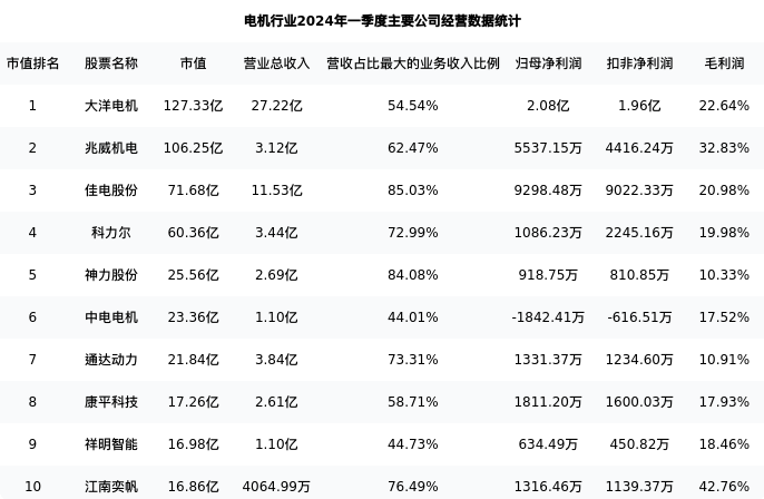 江南奕帆最新报告期数据为一季度,下表汇总了电机行业内市值靠前的公司一季度主要经营数据