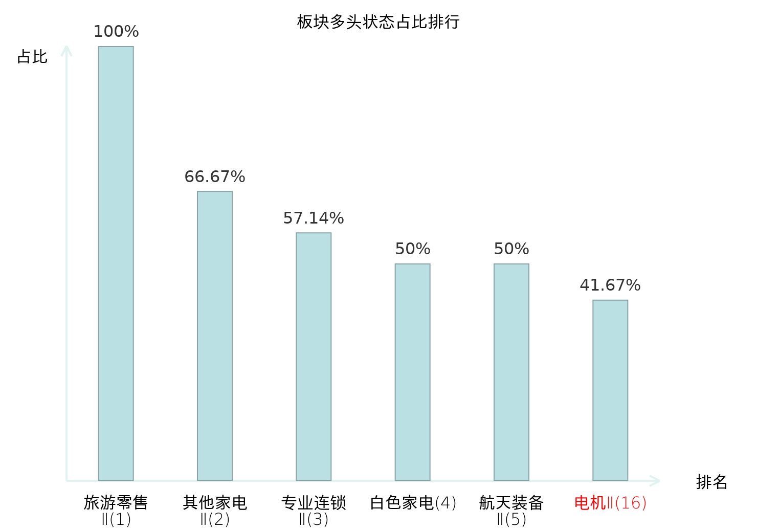 全市场所有行业板块中主力多头状态占比排名中,旅游零售Ⅱ板块位居第一。股份制银行Ⅱ板块名次提升最快,较昨日上升79位。