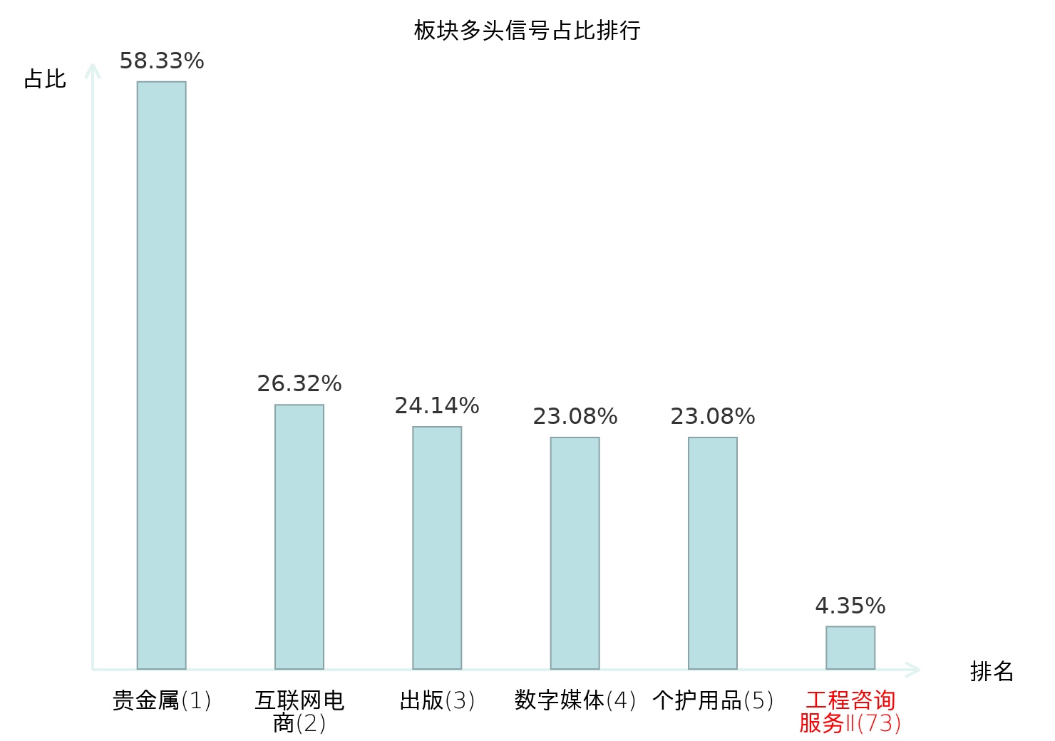 全市场所有行业板块中主力多头信号占比排名中,贵金属板块位居第一。贵金属板块名次提升最快,较昨日上升108位。