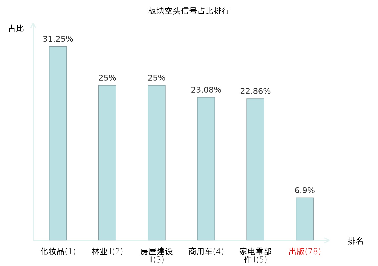 全市场所有行业板块中主力空头信号占比排名中,化妆品板块位居第一。房屋建设Ⅱ板块名次提升最快,较昨日上升113位。