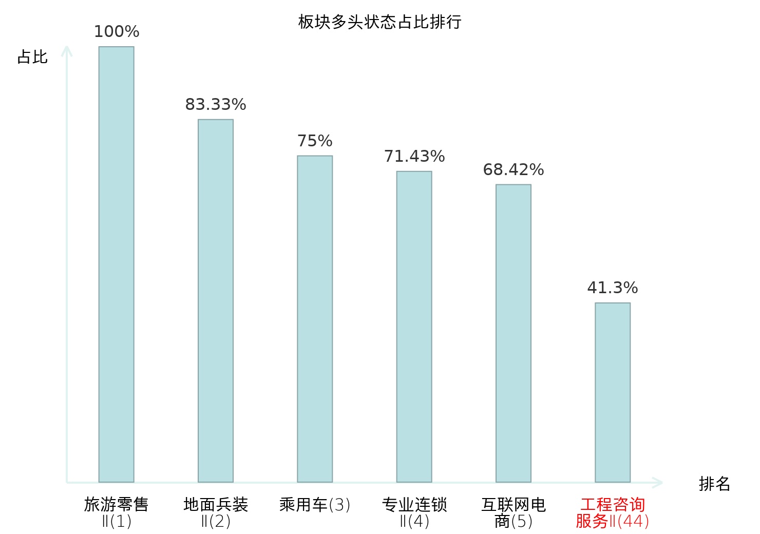 全市场所有行业板块中主力多头状态占比排名中,旅游零售Ⅱ板块位居第一。其他家电Ⅱ板块名次提升最快,较昨日上升55位。