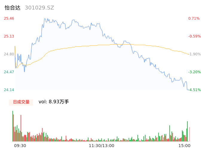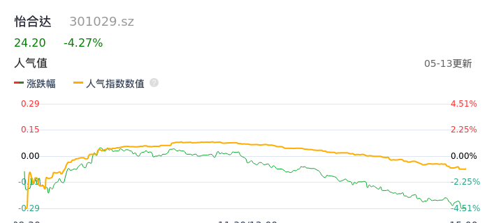 05月13日,怡合达收报24.20,股价涨幅-4.27%,成交金额2.21亿元,换手率3.00%。
