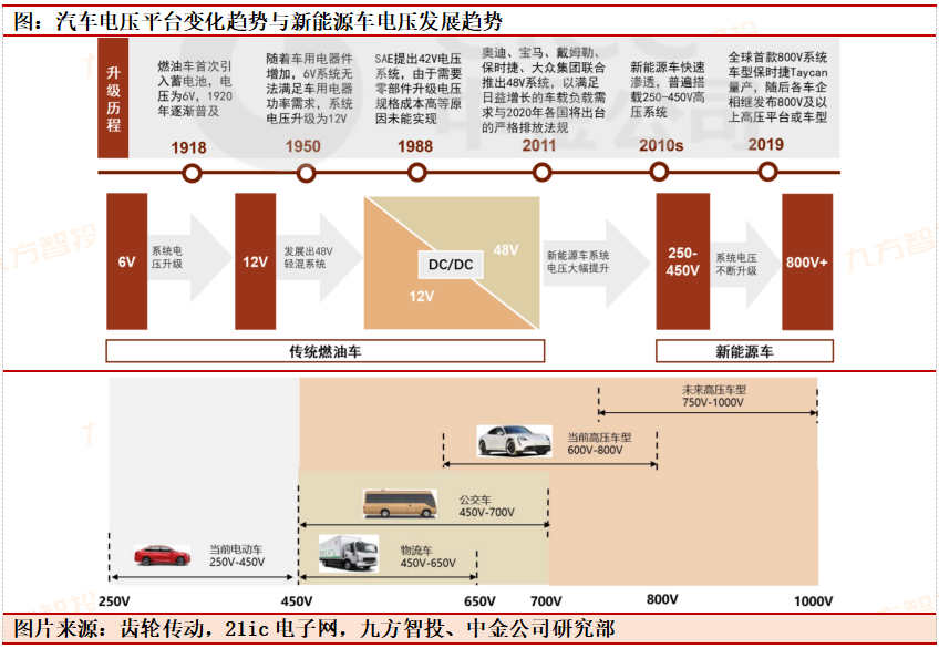 2019年,保时捷Taycan上市,成为全球首款搭载800V超高压系统的车型,随后全球各车企相继发布800V及以上超高压平台与车型,新能源车电压升级趋势明显。