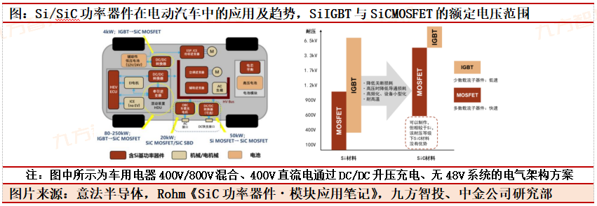 当前400V车型中一般采用SiIGBT器件,而800V车型中则需升级至SiCMOSFET,虽然SiIGBT、SiCMOSFET均可满足1200V耐压需求,但SiCMOSFET基于其材料和器件结构特性,具备低损耗、高频率等显著优势。