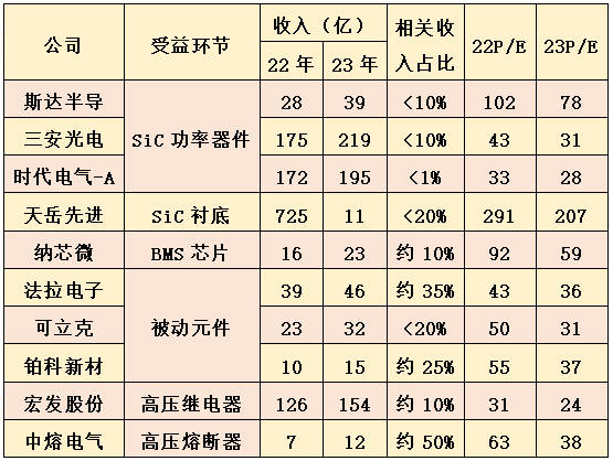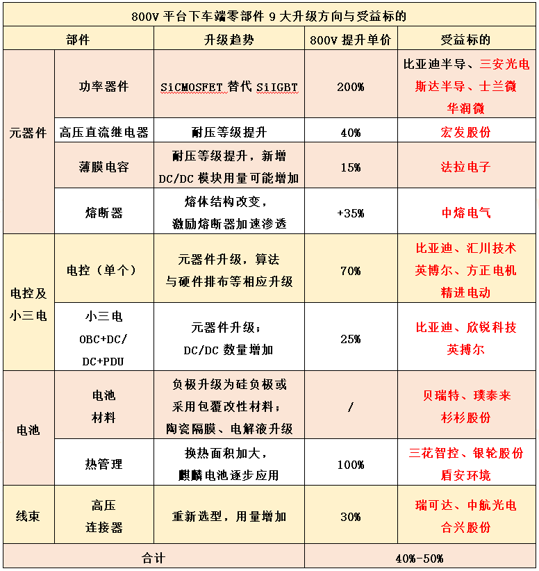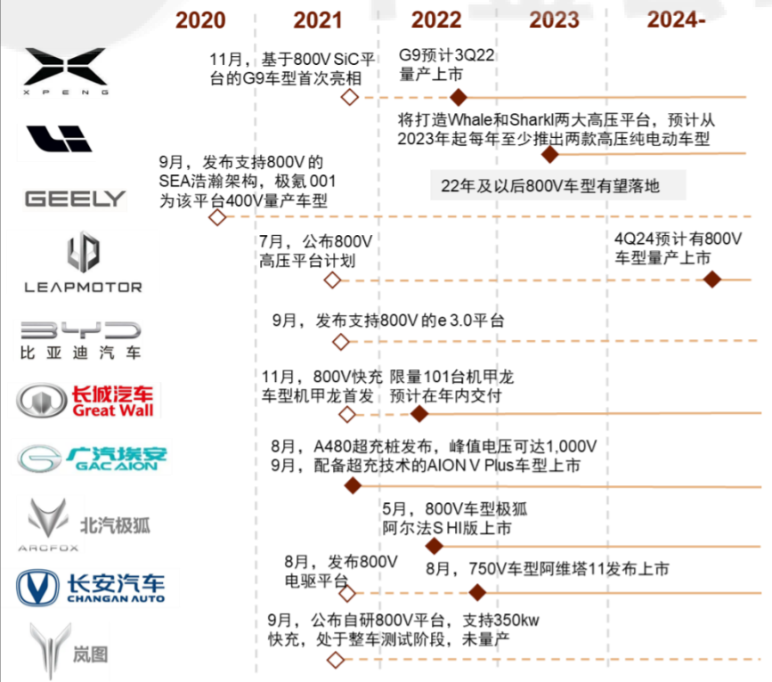 整车厂方面,目前在800V平台领先布局的厂商包括比亚迪、广汽集团、小鹏汽车等,上述厂商有望率先落地800V车型,提升产品力,形成差异化竞争。