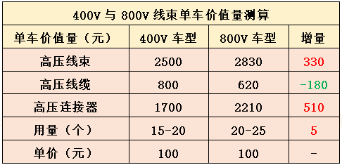 400-800V平台升级要求高压连接器重新选型。用量上,800V车型需要增加大功率快充接口,同时新增的400-800V及800-400V的DC/DC部件也需要配备连接器。估算,800V车型所需高压连接器个数增加至20-25个,单价提升至2210元。整车高压线束(线缆+连接器)单价小幅上升,由2500元提升至2830元。