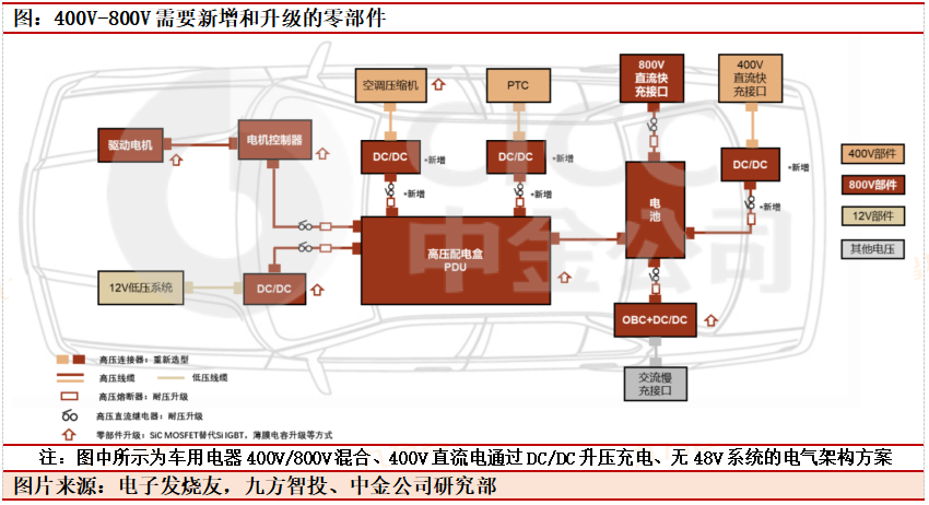 预计800V高压平台将带来多处车载零部件升级。电压平台由400V向800V升级,将带来车载零部件几大升级趋势: