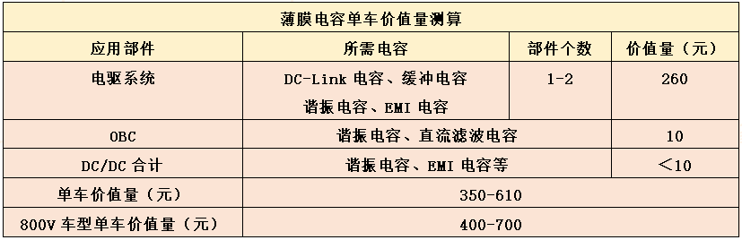 新能源车中薄膜电容单车价值量约350-610元。我们估算,新能源车电驱系统薄膜电容价值量约260元,双电机车型价值量翻倍;其中OBC中薄膜电容价值量约70-90元;DC/DC转换。