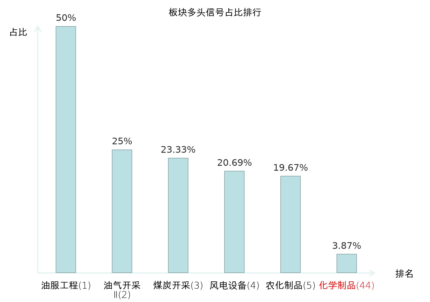 全市场所有行业板块中主力多头信号占比排名中,油服工程板块位居第一。油气开采Ⅱ板块名次提升最快,较昨日上升125位。