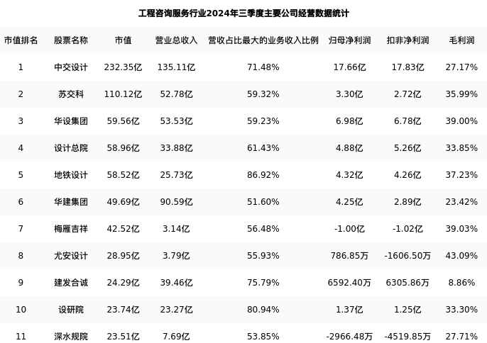 深水规院最新报告期数据为三季度,下表汇总了工程咨询服务行业内市值靠前的公司三季度主要经营数据