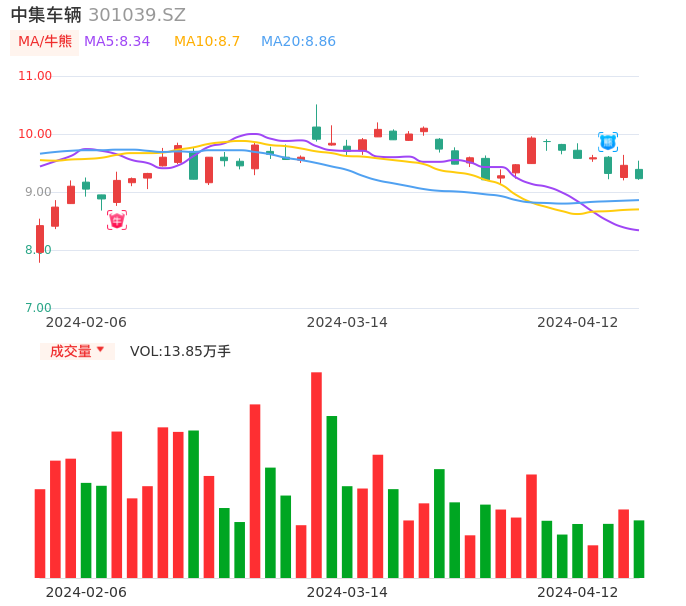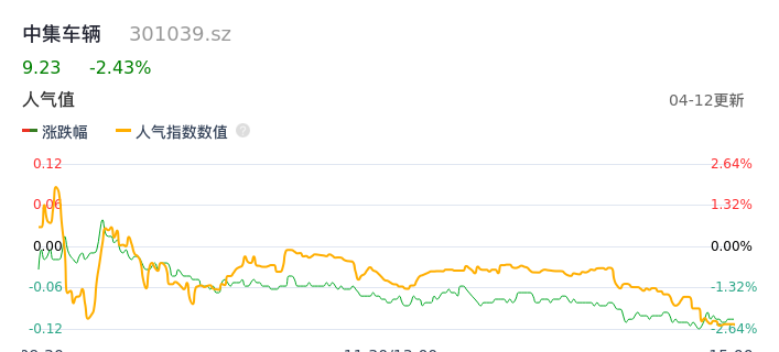 04月12日,中集车辆收报9.23,股价涨幅-2.43%,成交金额1.29亿元,换手率1.91%。