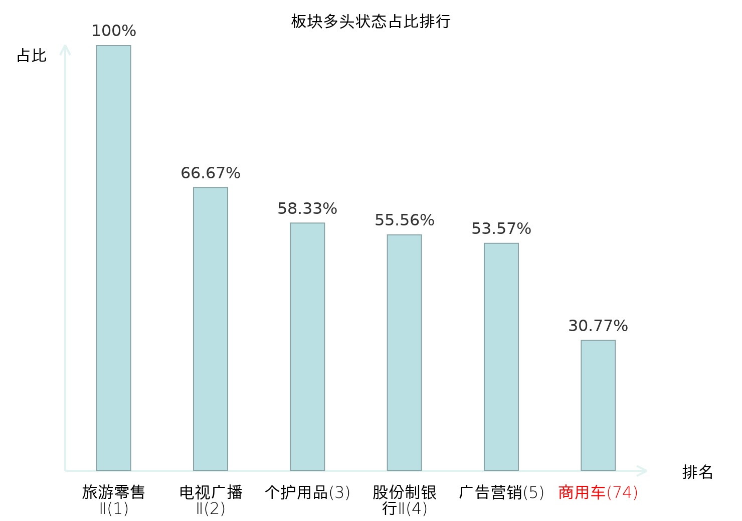 全市场所有行业板块中主力多头状态占比排名中,旅游零售Ⅱ板块位居第一。国有大型银行Ⅱ板块名次提升最快,较昨日上升106位。