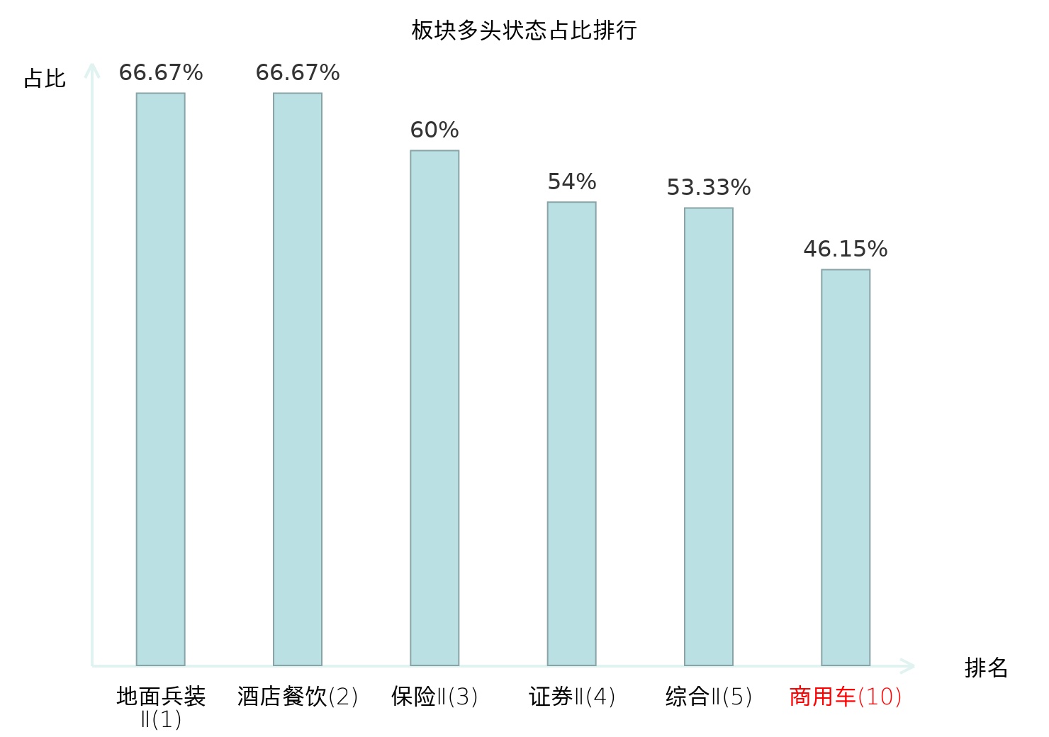 全市场所有行业板块中主力多头状态占比排名中,地面兵装Ⅱ板块位居第一。计算机设备板块名次提升最快,较昨日上升48位。