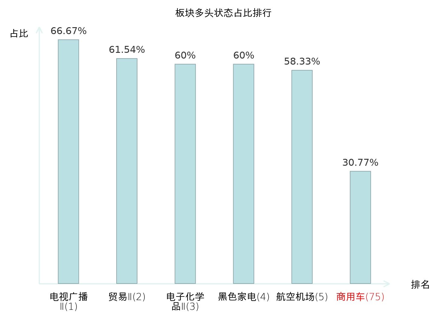 全市场所有行业板块中主力多头状态占比排名中,电视广播Ⅱ板块位居第一。黑色家电板块名次提升最快,较昨日上升80位。