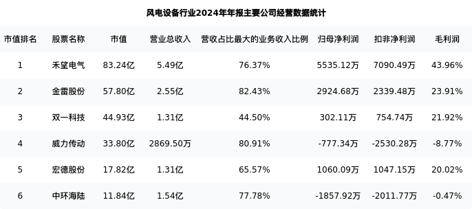 中环海陆最新报告期数据为年报,下表汇总了风电设备行业内市值靠前的公司年报主要经营数据