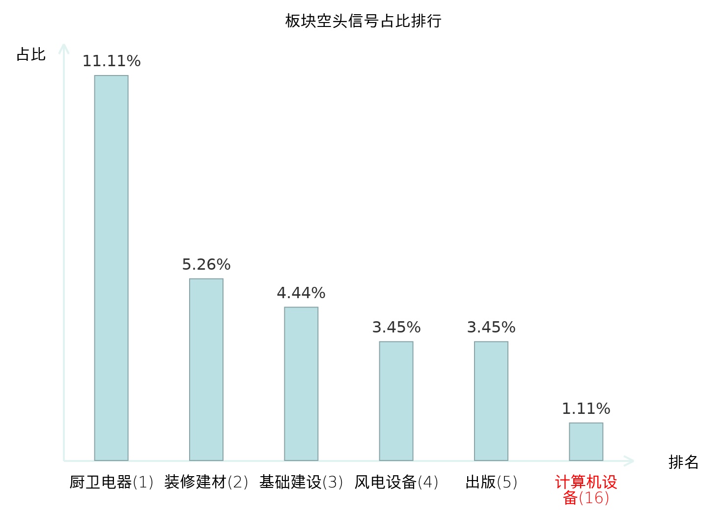 全市场所有行业板块中主力空头信号占比排名中,厨卫电器板块位居第一。塑料板块名次提升最快,较昨日上升121位。